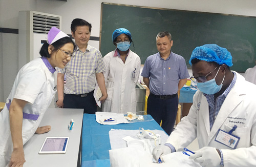 今年有四名在临床医学院/附属医院实习的留学生也按要求参加了本次毕业技能多站考试。张南华书记观看了他们的操作过程,他指出,因留学生前期教学的特殊性,要求各临床科室要在留学生实习过程中认真带教,要安排部分实践操作到技能中心进行训练。