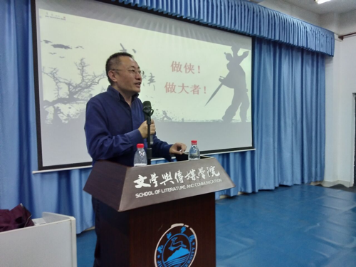 11月5日晚,中国武侠文学学会副会长,西南大学文学韩云波教授来我校举行学术讲座。在文友楼205教室为文传学院师生作了一场题为“金庸小说的‘中国道路’”的学术报告。副校长陈春生主持报告会。校团委负责人、文传学院班子成员、教师代表及100余名学生聆听了此次讲座。
