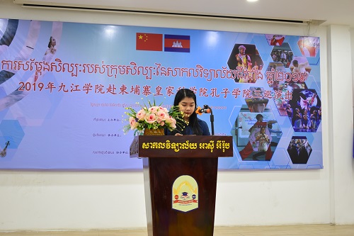 柬埔寨皇家科学院孔子学院于2009年正式在这片古老而又年轻的高棉大地落地生根,并在一代又一人的努力下蓬勃发展,终于在今年迎来了属于自己的第一个十周年。为了庆祝十周年,助力汉语教学,传播中华文化,增进中柬友谊,柬埔寨皇家科学院孔子学院特邀九江学院文化艺术团来柬进行文化巡演和交流。