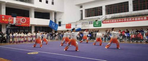 2019年江西省大中小学生武术套路比赛在华东交通大学开赛。本次比赛由江西省教育厅、江西省体育局主办,由华东交通大学、江西省学生体育协会、江西省武术运动管理中心承办。共有来自全省各市(市、区)大中小学等45支参赛队400余人参赛。此次比赛一共分为小学组、初中组、高中、本科甲组、本科乙组、专科组六个组别。