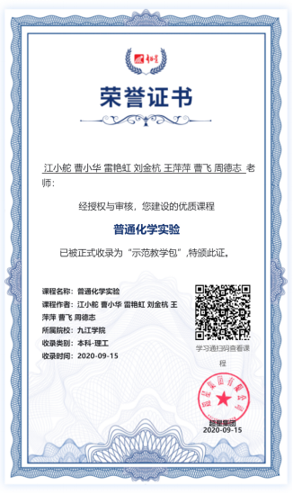 日前,经“超星集团”评审,认为我校化学与环境工程学院江小舵博士、曹小华教授等主讲的《普通化学实验》的课程教学内容丰富、教学方法新颖、讲解条理清楚、制作水平精良,深受广大学生欢迎喜爱。经授权与审核,该课程已被正式收录为超星学习通“示范教学包”优质课程。