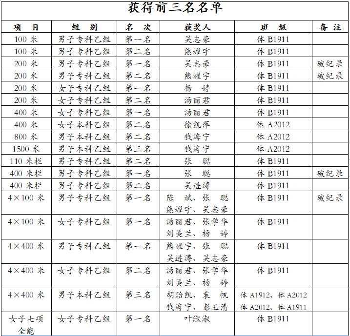 本次比赛由我校体育学院党委副书记冯亚兵领队,陈剑兴、刘利江、曹钧三位老师任教练带队参赛。我校派出的24名运动员分别参加了男、女本科甲组,男、女本科乙组以及男、女专科乙组的27个项目的比赛,斩获了9金8银2铜,并有38人次获得前八名,打破男子专科乙组200米(我校两名运动员均打破记录并获得冠亚军)、400米栏、4×100米省大学生田径运动会赛会纪录。我校还在没有专科甲组运动员参加的情况下,获得专科组男子团体第一名、女子团体第四名和男、女团体第二名的好成绩。