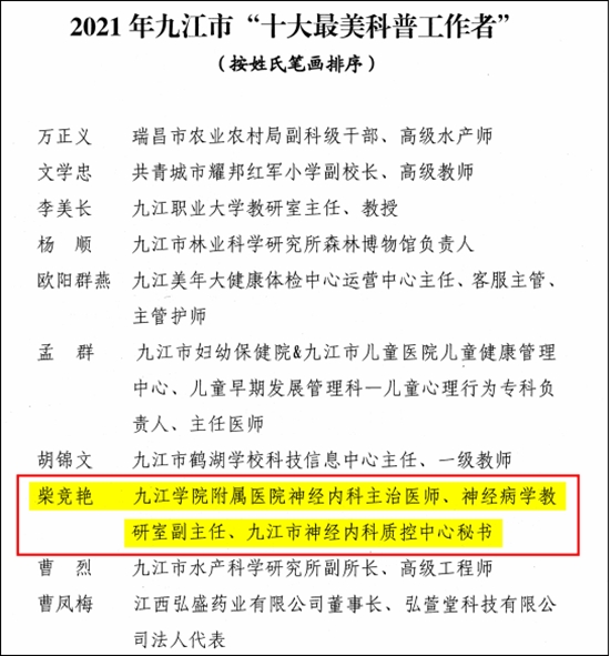 近日,中共九江市委人才工作领导小组办公室、九江市科学技术局、共青团九江市委、九江市科学技术协会联合下发了《关于选树2021年九江市“十大最美科技工作者”、“十大最美青年科技工作者”、“十大最美科普工作者”的行决定》,附属医院党委副书记谷翔教授获2021年九江市“十大最美科技工作者”、该院神经内科柴竞艳医师获九江市“十大最美科普工作者”荣誉称号,附属医院成为本届唯一收获两项殊荣的医疗系统单位。