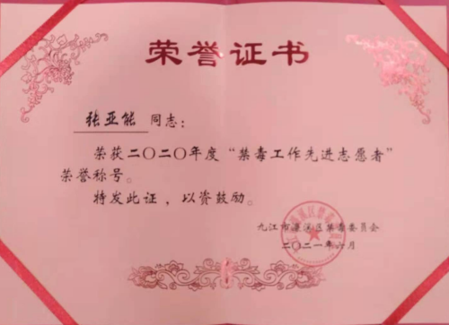 日前,我校被九江市濂溪区禁毒委员会授予2020年度全区禁毒工作“先进单位”,马克思主义学院张亚能老师被评为2020年度“禁毒工作先进志愿者“荣誉称号。