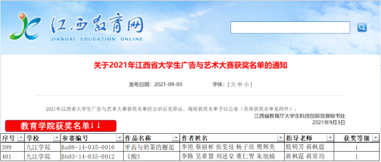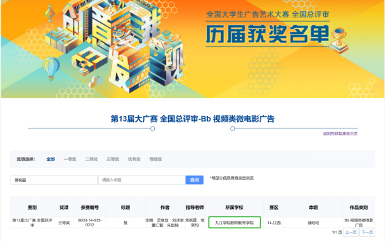 9月17日,2021年第十三届全国大学生广告艺术大赛全国总决赛获奖名单公布,我校教育学院选送的2项作品在全国481947组作品中过关斩将荣获佳绩。其中由蒋枫霆、蒋常均老师指导,李腾、吴章慧、刘述皇、董仁智、朱旭楠同学共同创作的微电影作品《酸》荣获全国总决赛三等奖、江西省级一等奖,这也是我校在国赛微电影类别中唯一一项获得等级奖的作品;由殷明芳、蒋枫霆老师共同指导,李艳、蔡丽彬、张雯佳、杨子欣、樊辉美同学创作的微电影作品《牙齿与奶茶的邂逅》荣获江西省级一等奖。此项赛绩实现了教育学院在大广赛全国总决赛等级奖中“零”的突破。