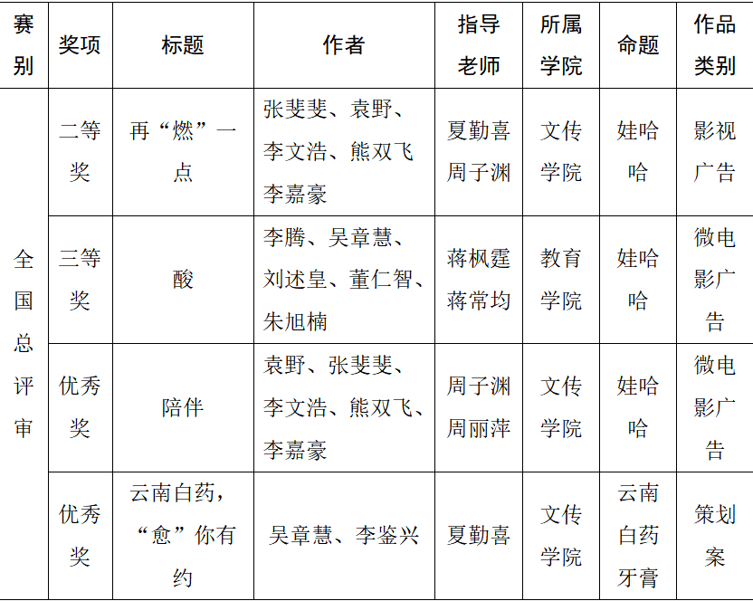 9月17日,第13届“全国大学生广告艺术大赛”(简称“大广赛”)官网公布全国总决赛获奖名单,我校文传学院、教育学院学子获二等奖1项,三等奖1项,优秀奖2项,创我校参赛历史最好成绩。
