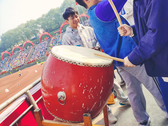 记者注意到,每个学院观众席前,都有一架红色的鼓。学生鼓手挥动击鼓棒,鼓声阵阵,激动人心。建工学院A1912的鼓手张海同学接受采访说:“我是学院的一份子,想要尽一份力,为自己的学院加油!”此外,他还向记者谈到,自己虽然没有参加赛事项目,但是作为鼓手的他能为大家带来的是自己的热情和观众的欢呼。