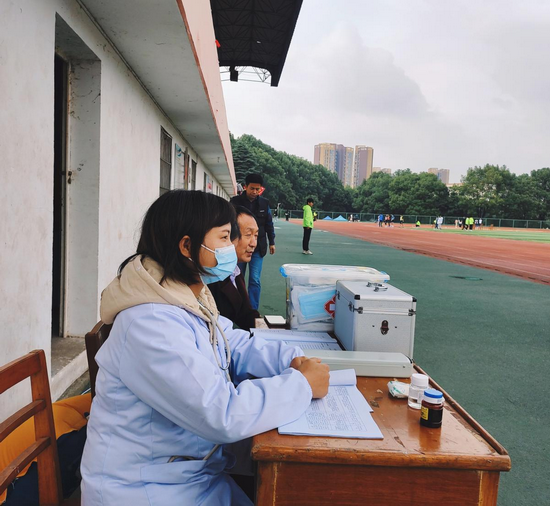 为了落实疫情防控工作,保障广大师生和运动员的安全。校医院在运动场上设置了医疗工作点。郭菲医生接受采访时说:“我们主要做一些医疗保障工作,如果运动会出现意外情况,我们可以提供帮助。”每当帮助到有需要的同学,她说自己心里会很开心,而且只是在做本职工作。面对坚守岗位的医务人员,管理学院方素婧同学说:“有医护人员的地方,就会让人感到心安。”医护人员的存在,让同学们感到安稳。