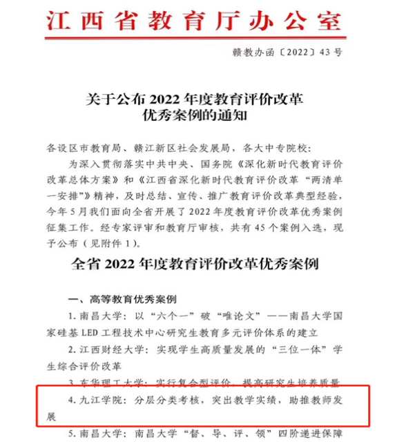 近日,省教育厅公布了江西省2022年度教育评价改革优秀案例征集评选结果,全省共有45个案例入选,其中高等教育优秀案例14个,我校《分层分类考核,突出教学实绩,助推教师发展》案例成功入选。