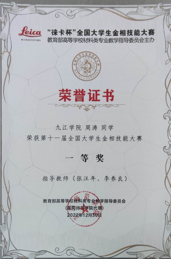 近日,由教育部高等学校材料类专业教学指导委员会主办、黄冈师范学院承办的第十一届全国大学生金相技能大赛落幕,共有来自清华大学、吉林大学、四川大学、武汉大学等414所高校的3700余名在校大学生参加了复赛和决赛阶段的比赛。我校材料科学与工程学院周涛同学荣获个人一等奖,余里泽同学荣获个人二等奖,叶德洲、黄事成同学荣获个人三等奖。