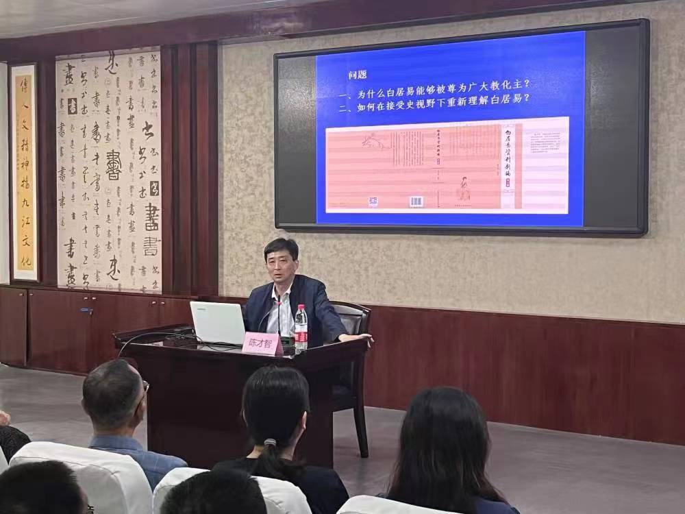 5月17日下午,中国社会科学院文学研究所研究员、中国社会科学院大学教授陈才智应邀在九江市图书馆作题为《春风吹又生——白居易研究的昨天、今天与明天》的学术讲座。讲座由九江学院文学院与九江市图书馆联合举办,近百名九江市民和我校文学院师生参加讲座。