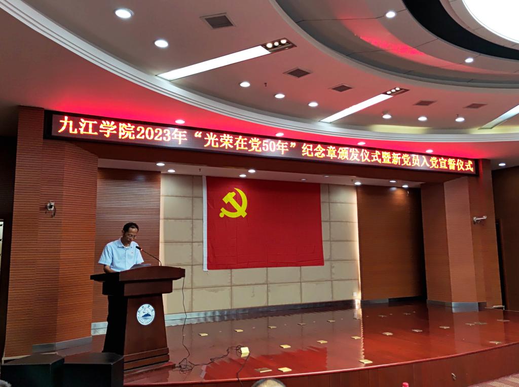 为深入推进学习贯彻习近平新时代中国特色社会主义思想主题教育,在即将迎来建党102周年之际,6月15日,我校举行“光荣在党50年”纪念章颁发仪式暨新党员入党宣誓仪式。校党委委员、副校长王殿元,市直机关工委委员周雷出席仪式并讲话;我校“光荣在党50年”纪念章获得者代表和大学生新党员代表80余人参加仪式。