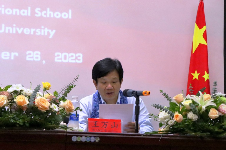 在致辞中,王万山代表学校向2023年入校的留学生表示欢迎,并希望留学生们尽快适应在九江学院的学习生活,珍惜宝贵的大学时光,积累知识,开拓视野,夯实基础,提升自我,圆满完成学业,在九江学院实现既定目标。