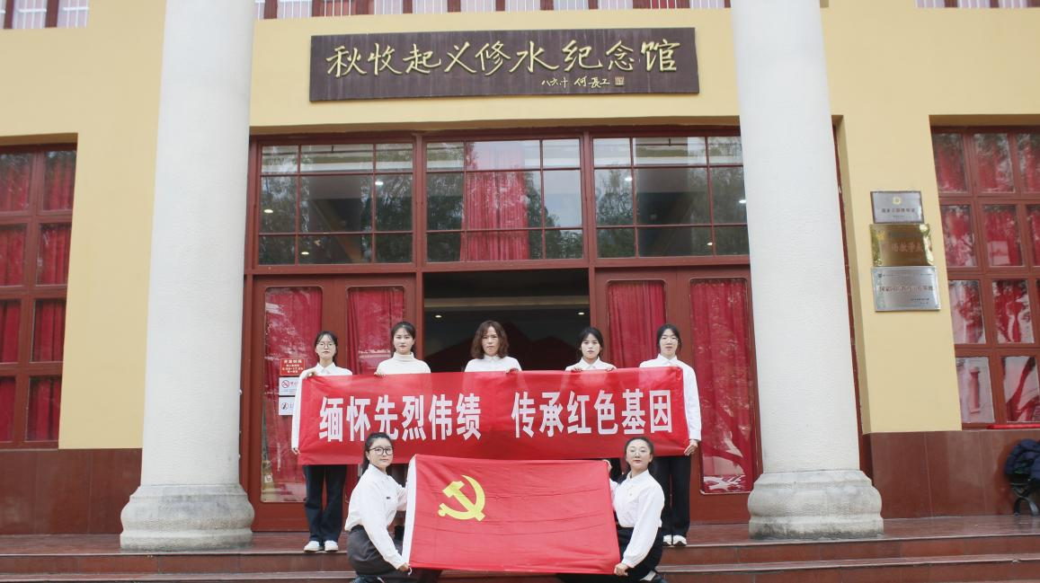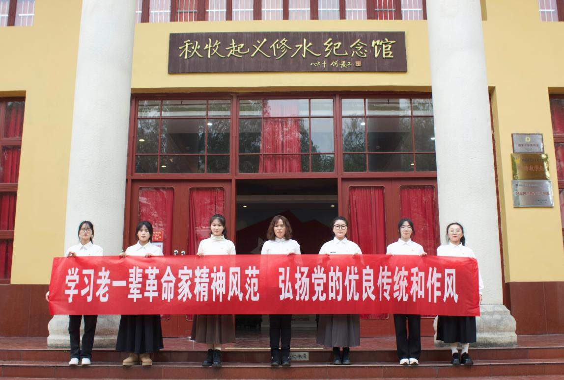 “ 军叫工农革命,旗号镰刀斧头,修铜一带不停留,便向平浏直进……” 秋收起义修水纪念馆内,九江学院管理学院学生第四党支部“ 红色走读” 研学团的青年党员,在工农革命军第一军第一师军旗巨型雕塑前深情朗诵,无限缅怀先烈伟绩。
