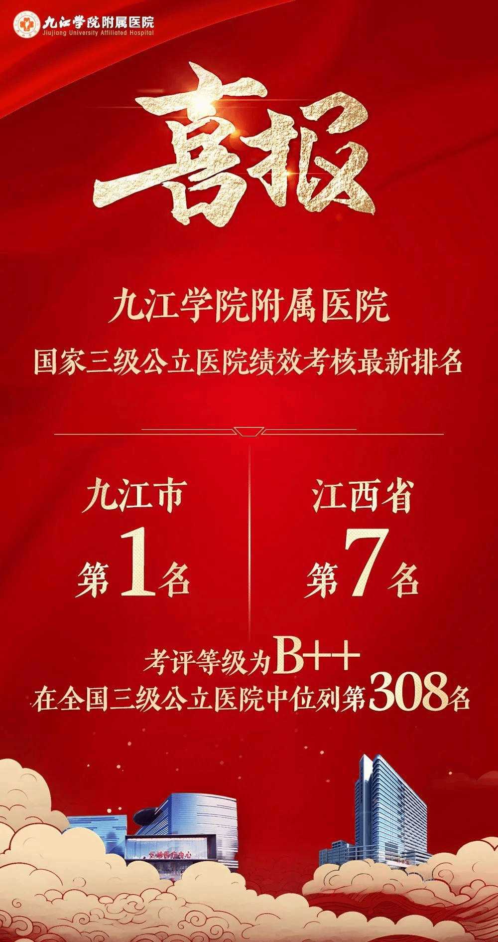1月8日,国家卫生健康委公布了2022年度全国三级公立医院绩效考核成绩单,九江学院附属医院再创佳绩,考评等级为B++,在全国1415家三级综合公立医院中位列第308名,在江西省排名第七,九江市排名第一。