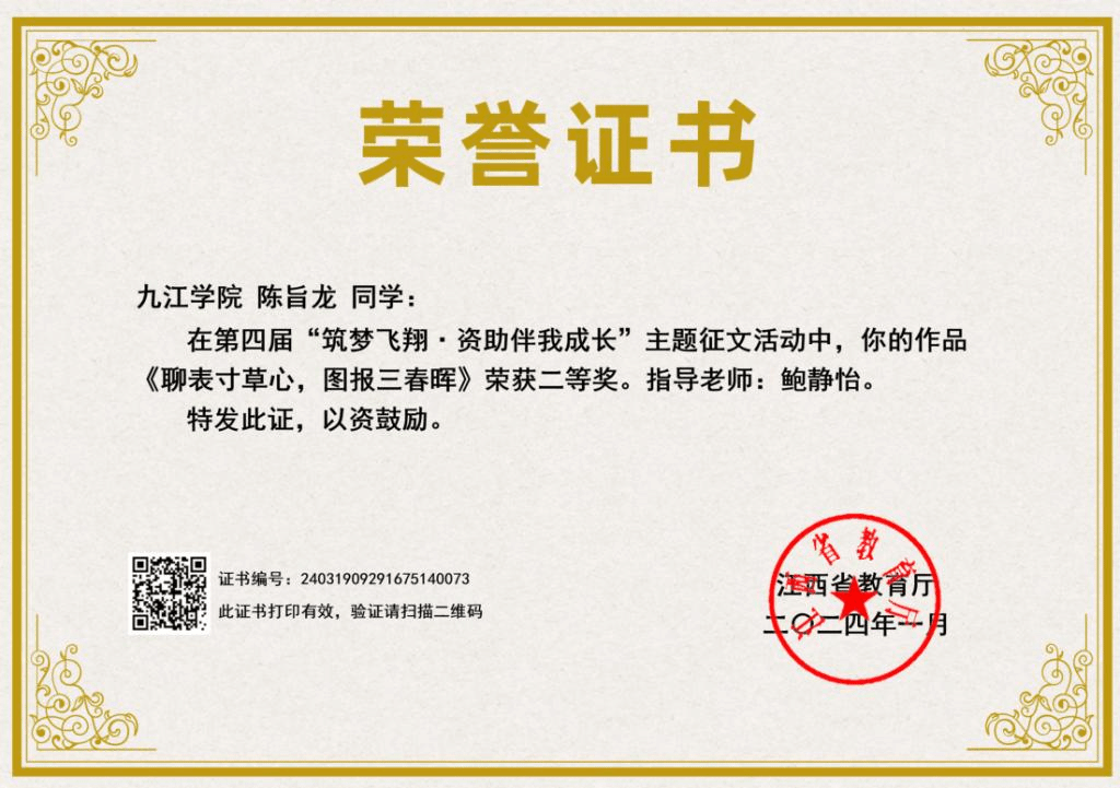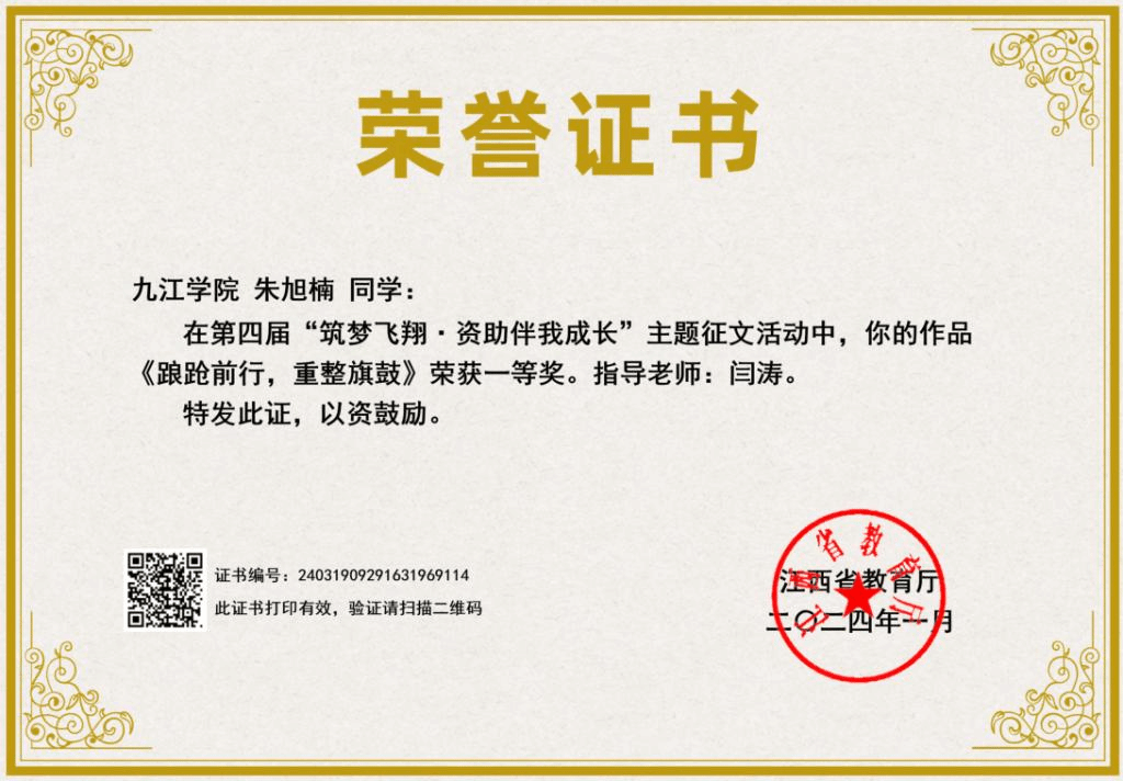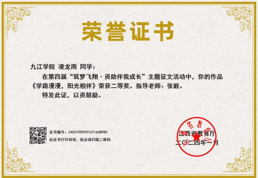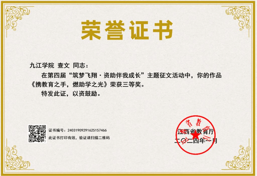 近日,江西省教育厅举办的第四届“筑梦飞翔•资助伴我成长”主题征文活动评选结果揭晓,我校教育学院朱旭楠同学的作品《踉跄前行,重整旗鼓》(指导老师:闫涛)荣获一等奖;管理学院凌龙雨同学的作品《学路漫漫,阳光相伴》(指导老师:张毅)、法学院龙叶同学的作品《春雨》(指导老师:雷利桂)、文学院陈旨龙同学的作品《聊表寸草心,图报三春晖》(指导老师:鲍静怡)均荣获二等奖;机械与智能制造学院查文老师的作品《携教育之手,燃助学之光》荣获教师组三等奖。同时,九江学院荣获优秀组织奖。