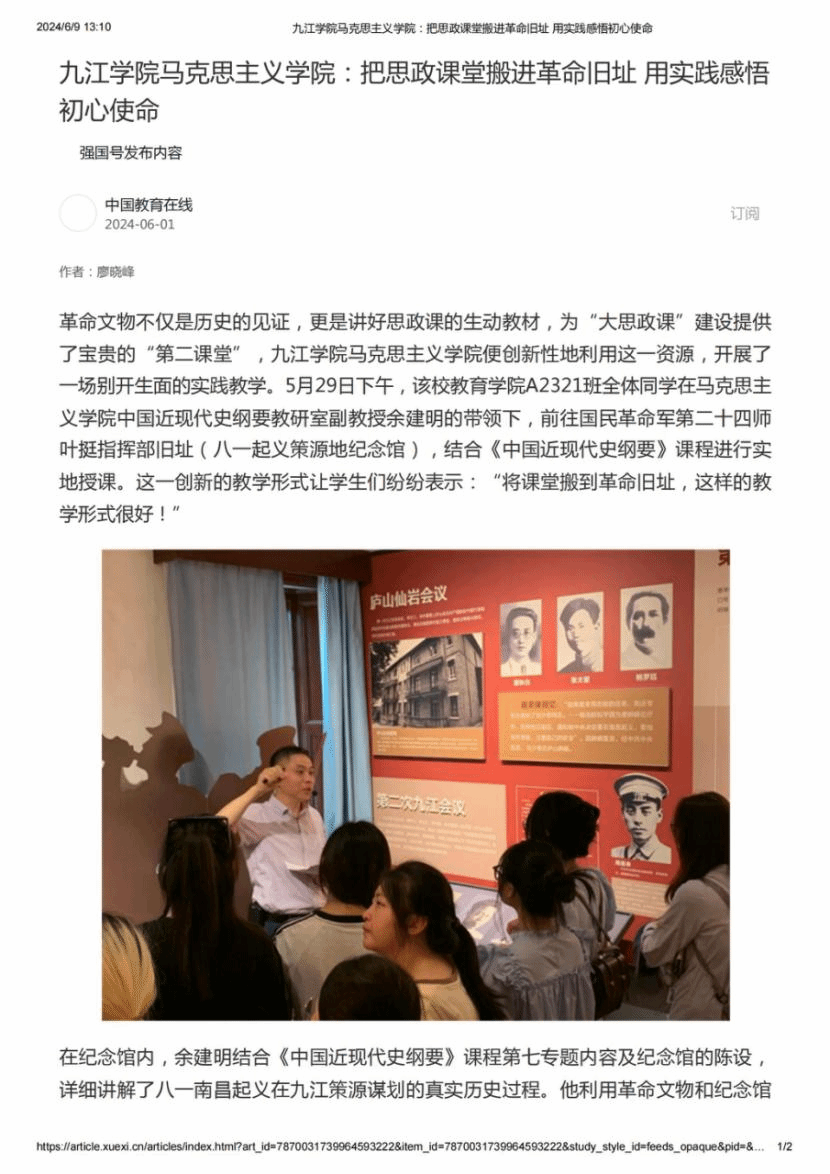 中国教育在线强国号发布:九江学院马克思主义学院:把思政课堂搬进革命旧址 用实践感悟初心使命