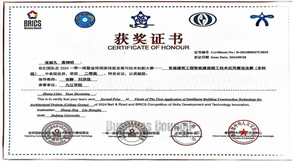 近日,2024一带一路暨金砖国家技能发展与技术创新大赛首届建筑工程智能建造施工技术应用赛项全国总决赛在杭州圆满落幕。本届智能建造赛项决赛经过前期覆盖全国600余所高校的校园赛及区域选拔赛,最终415支队伍入围总决赛。我校建工学院张丽凡,袁神明两位同学参加此次比赛,经过激烈比拼,最终荣获本科组二等奖;我校获得“优秀组织奖”,指导教师张静、刘洪佳获“优秀指导教师”荣誉称号。