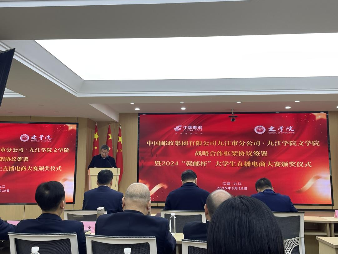 签约仪式上,文学院与中国邮政九江市分公司签署战略合作协议。根据协议内容,双方将在主题邮局建设、文化创意开发、直播电商实践基地共建等领域展开深度合作。