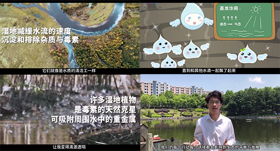 作品的创作灵感源自长江生态文明试验班组织的鄱阳湖湿地生态实践。在实地调研中,王睿同学观测水文数据、记录候鸟迁徙路径,通过分析水循环动态,将蒸发、凝结等专业概念转化为水滴冒险等趣味情节,作出可视化叙事,使作品兼具学术严谨性与公众传播力。同时,作品还用无人机航拍了鄱阳湖四季景观,枯水期的草洲、丰水期的浩渺水面转化场景加入到视频中,增强了视觉表现力。