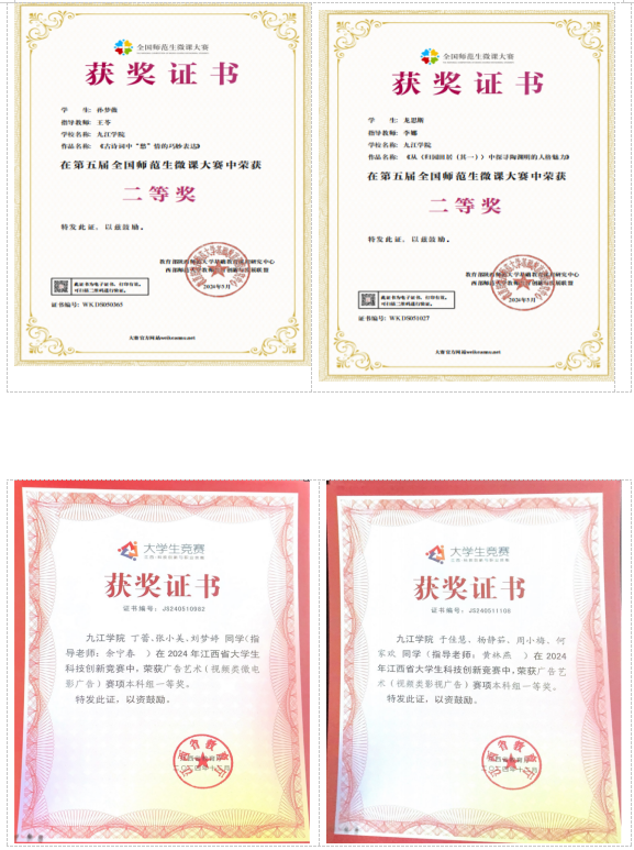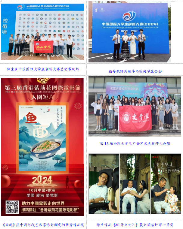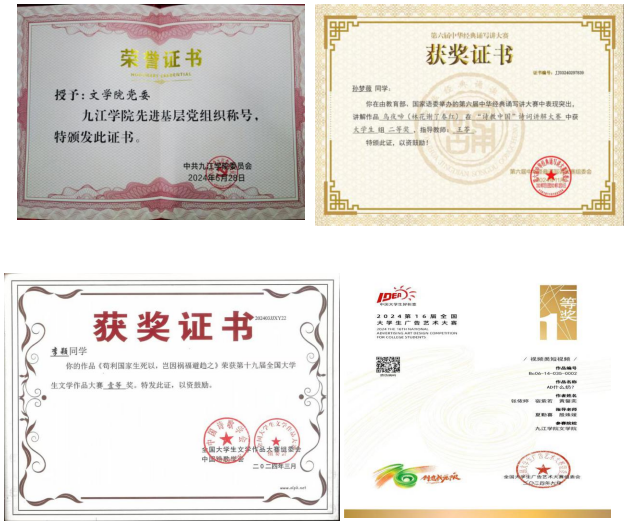 学院高度重视学生全面发展,通过多种途径助力学生成长。积极组织学生参加各类竞赛,在写作大赛、多媒体制作大赛等赛事中,学生每年获得国家级和省级奖励200余项,2024年,文学院代表学校获得中国国际大学生创新大赛银奖1项,实现了九江学院参赛以来国家银奖首次突破。2024年,文学院参与摄制的纪录片《鱼面》获中国电视艺术家协会颁发的优秀作品奖,为江西省唯一获奖作品。