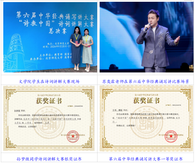 3.深耕普通话推广,国赛舞台展锋芒。文学院积极投身于国家通用语言文字推广工作,收获了一系列突破性成绩。2024年,在教育部、国家语委共同主办的第六届中华经典诵写讲大赛全国总决赛中,我院师生在国赛中斩获佳绩,荣获一等奖1项、二等奖2项、优秀奖1项、优秀指导奖1项。