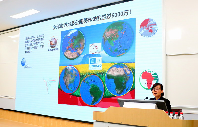 4月23日下午,旅游与地理学院联合庐山世界地质公园,在竞知楼阶四教室举办了一场主题宣传活动。李四光纪念馆特聘专家、李四光先生的外孙女邹宗平老师,以《石迹耿千秋—李四光的故事》为题,用朴实的小故事,生动介绍了李四光先生的科学家精神与爱国情怀。她鼓励同学们“努力向学,蔚为国用”,现场掌声雷动,深受鼓舞。