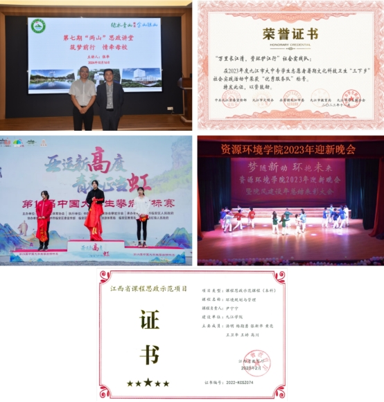 以专业核心课为抓手做好能力培养导向在教学过程中的体现,全面提升课程教学水平。学院获评江西省一流课程1门,校级一流课程4门,校级校企合作课程2门。开展竞赛强师工程,推动教师业务素养与教学能力的全面提升,学院教师获得江西省教学创新大赛三等奖1项,江西省青年教师教学竞赛三等奖1项,九江学院教师课堂教学竞赛三等奖1项。以地域生态文明教育为特色的人才培养经验获评江西省教学成果奖一等奖1项(排名第二)、二等奖1项,获评江西省教学成果奖青年培育项目1项,九江学院教学成果奖特等奖1项、二等奖2项;“问山问水”生态文明教育教学团队为江西省高水平本科教学团队,生态文明教研室获批江西省首批虚拟教研室。