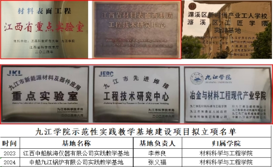【专业与平台】材料科学与工程学院学科建设成效显著:材料加工工程学科为江西省“十二五”重点学科;材料成型及控制工程专业为江西省一流专业;焊接技术与工程专业为九江学院应用型试点专业。建有江西省材料表面再制造工程技术研究中心、材料表面工程江西省重点实验室、九江市绿色再制造重点实验室、九江市新能源材料及器件应用重点实验室、九江市先进焊接工程技术研究中心等省市级科研平台5个。获批江西省重点产业学院(智能制造产业学院)1个,九江市重点产业学院(冶金与材料工程现代产业学院)1个,九江学院示范性实践教学基地2个。