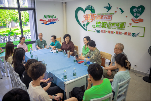 在“525心理健康日”来临之际, 九江学院关工委“心灵驿站”走进紫薇园五栋“一站式”学生社区,开展“倾听你的心声”活动。九江学院关工委执行主任吴桃娥教授携七名退休老教师、老专家与建工学院青年学生对话成长,倾听学生心声,助力他们以积极健康的心态迎接成长路上的挑战。