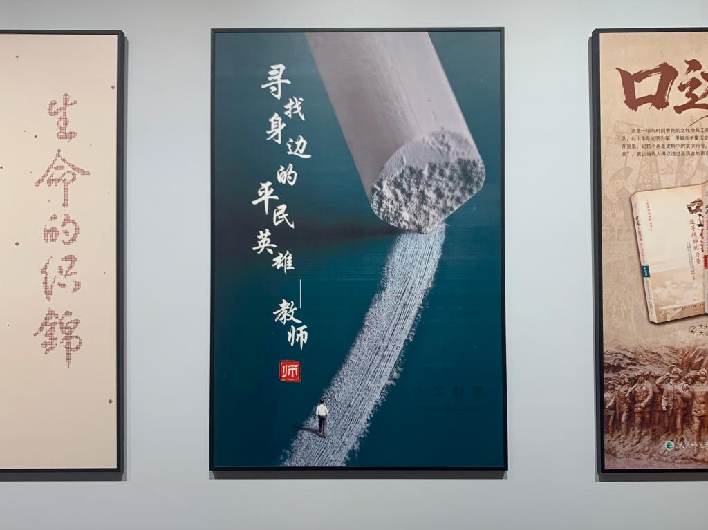 本次展览中,教育学院口述史项目团队精心制作的海报与宣传彩页吸引了众多与会者的目光。海报以“寻找身边的平民英雄——教师”为标题,背景为一支巨型粉笔画出的道路意象,画面下方是一位教师行走于路上的背影,面朝远方,象征着教育工作者默默耕耘、引领未来的精神。宣传彩页则系统介绍了项目的发起背景、实施过程和育人成效。