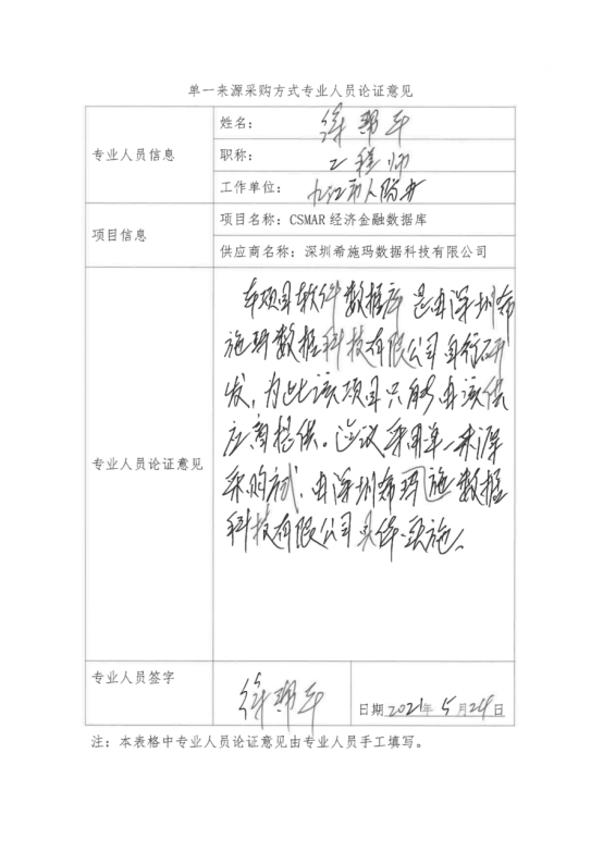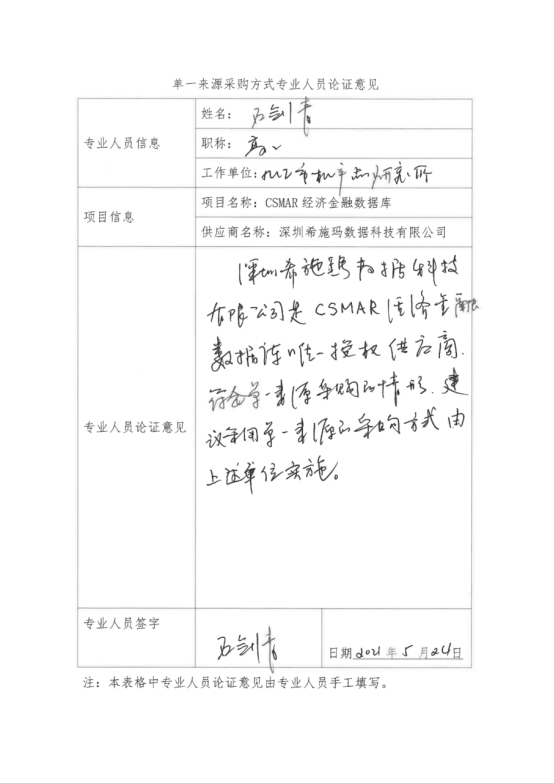 采用单一来源采购方式的原因及说明:CSMAR经济金融数据库是由深圳希施玛数据科技有限公司自主研发,为此该项目只能由深圳希施玛数据科技有限公司提供,建议采用单一来源采购方式,由深圳希施玛数据科技有限公司具体实施。